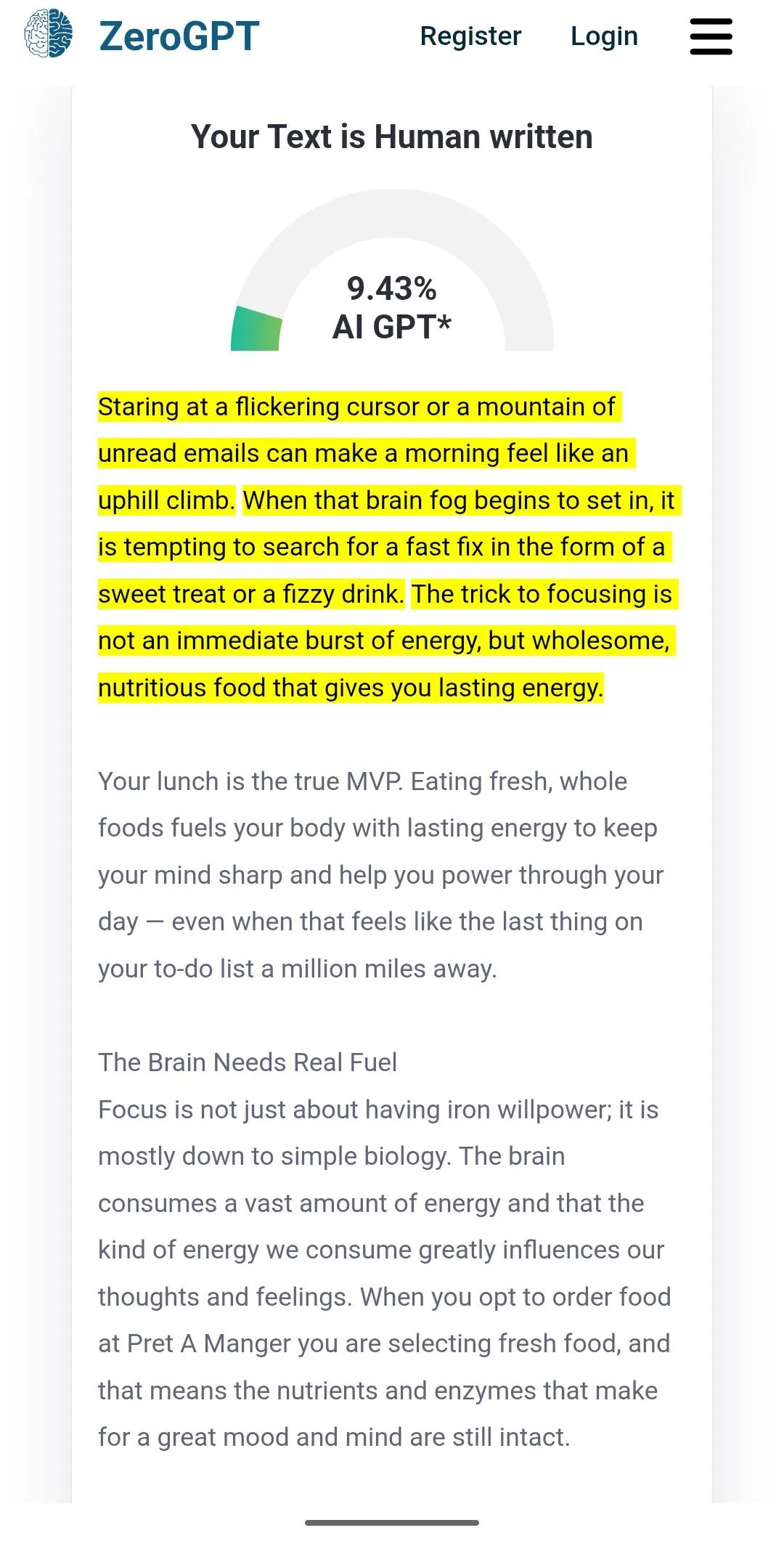 Focus is not just about having iron willpower; it is mostly down to simple biology. The brain consumes a vast amount of energy and that kind of energy we consume greatly influences our thoughts and feelings. When you opt to order food at Pret A Manger you are selecting fresh food, and that means the nutrients and enzymes that make for a great mood and mind are still intact.